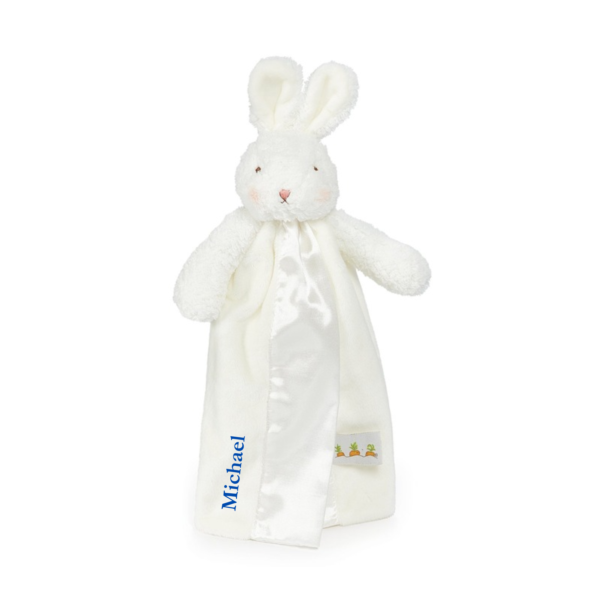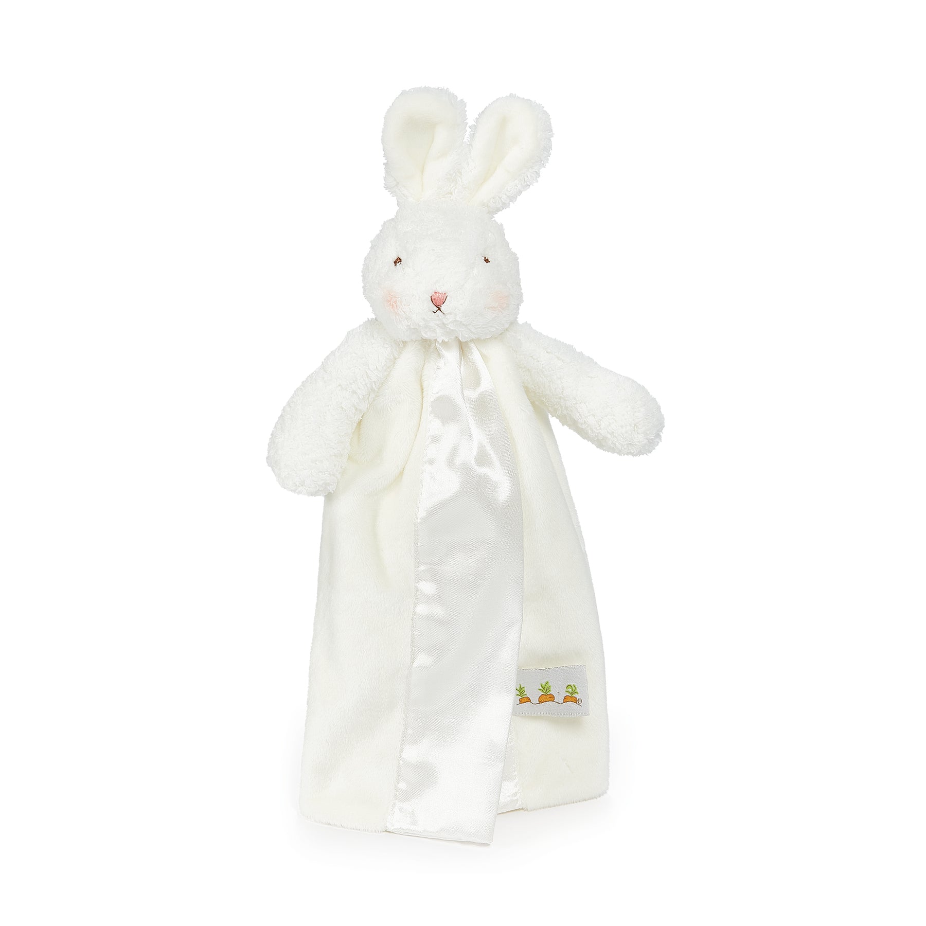 A smaller version of our best-loved Buddy Blanket, this Lovey is ready to be on the go. With a handy loop on the back to attach to the car seat, stroller or crib you're sure to never be left without this precious friend again. This favorite security blanket is a plush floppy eared bunny with handcrafted, baby-safe embroidered face and a snuggly soft white velour split blanket, lined and edged in silky satin. Signature three carrot tag for little one's fingers.