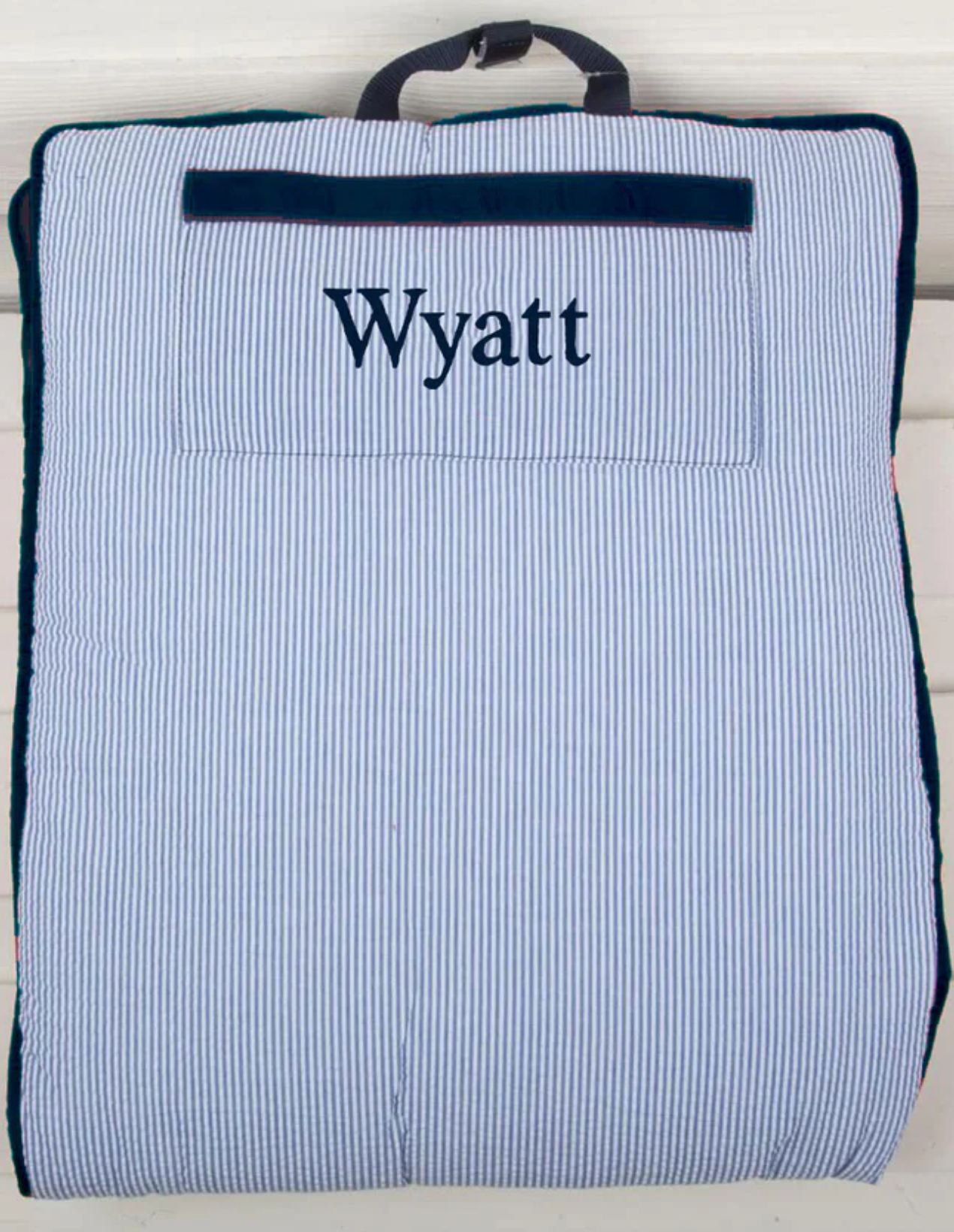 Padded and lined with nylon and cotton with a ribbon-trimmed, soft, fleecy blanket. Easily rolls up and can be carried by the toddling toddlers on their way to camp, preschool, or to the corner for a time out.